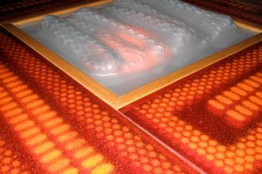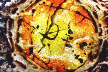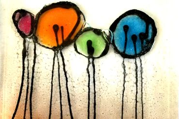 Pollockesque fireball strewn on a glass canvas, geometric rings, organic sweeps and curls, just some of the elements in this devolving range of kiln formed glass panels